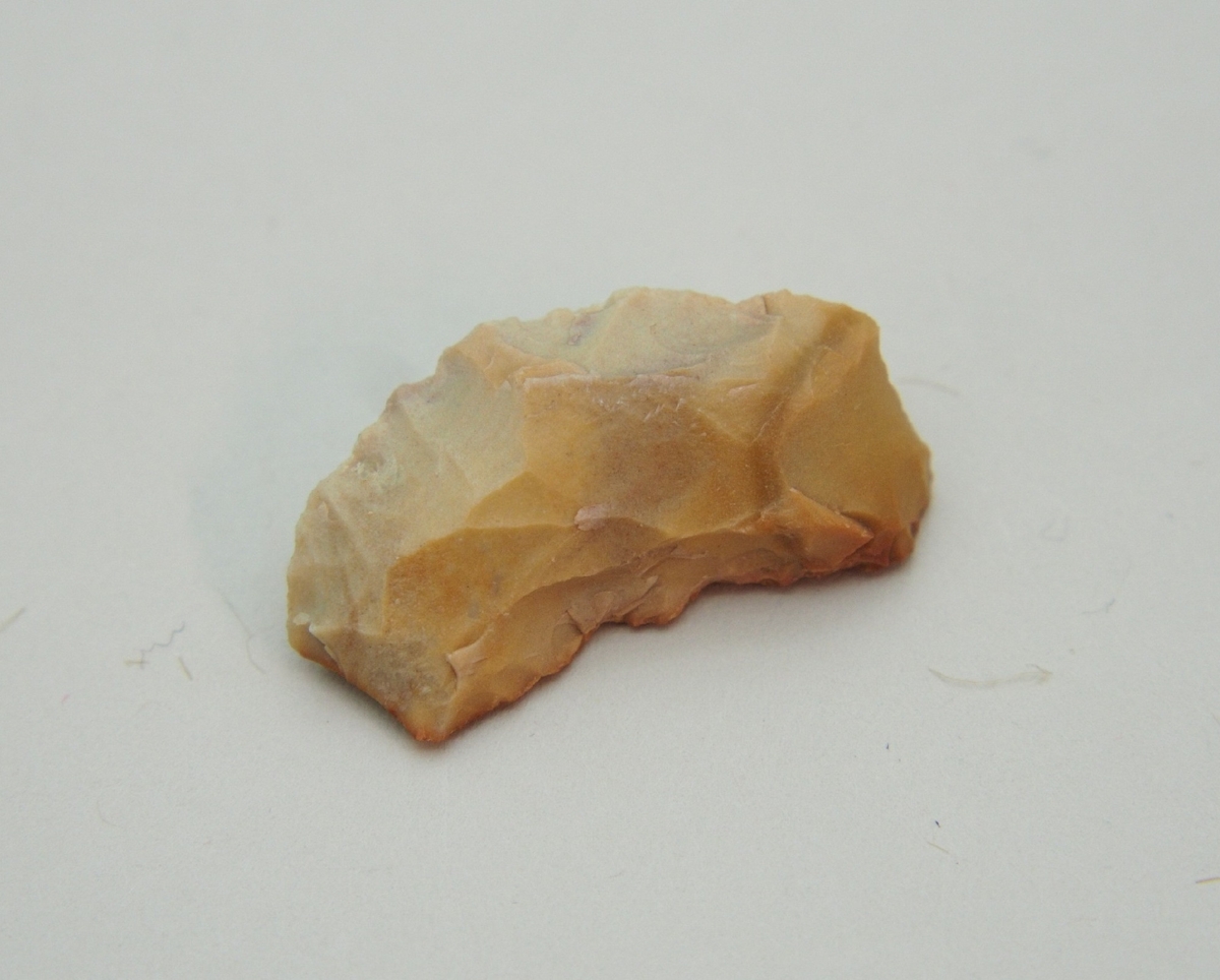 A debitázstengelyre szimmetrikus, szilánkon készült, intenzíven használt vakaró/kaparó eszköz maradványa ('tula slug'). Talonján (bázisán) a nyersanyag külső erodált felszíne.