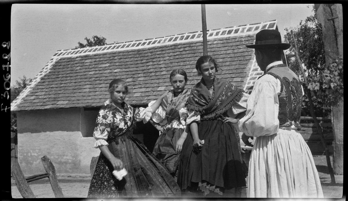 Szűrposztó mellényes férfi lánycsoporttal