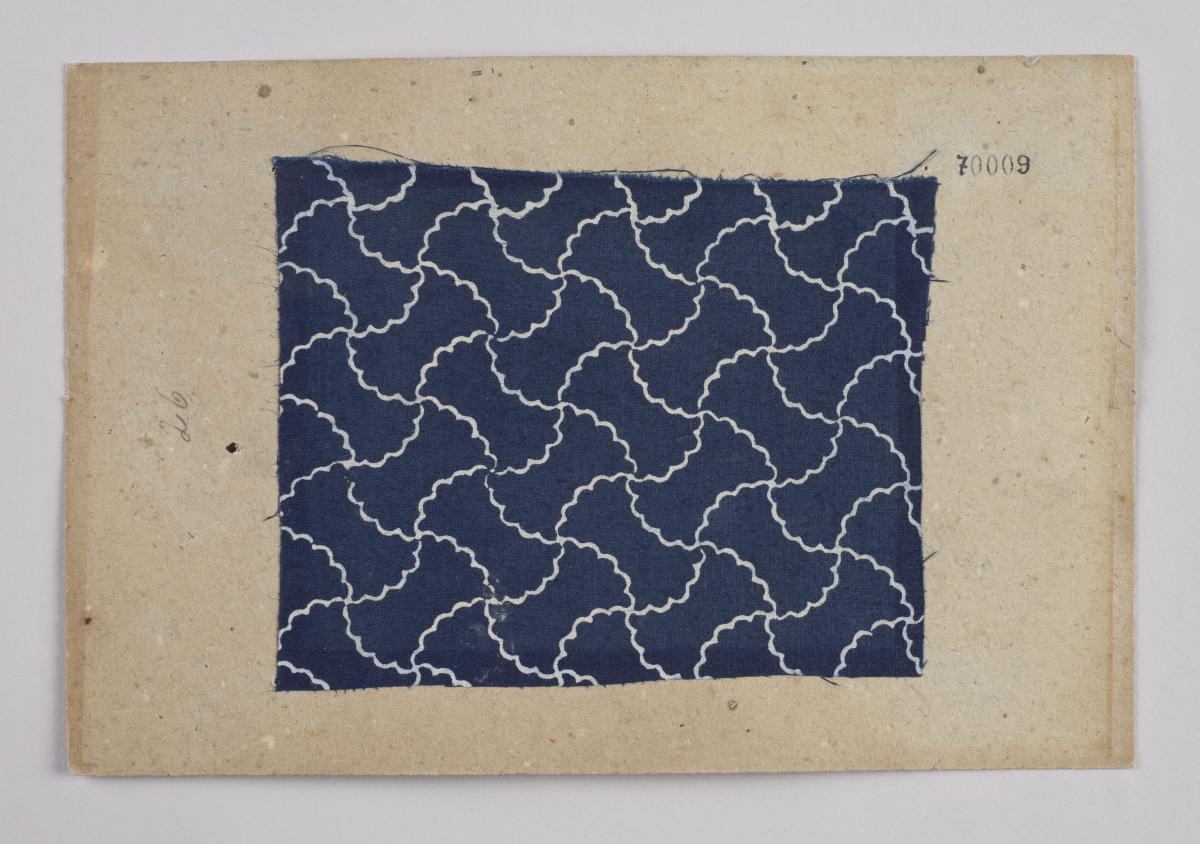 Téglalap alakú kartonpapírra felkasírozott textil darab, kékre festett gyolcson fehér "villámos" mintával.