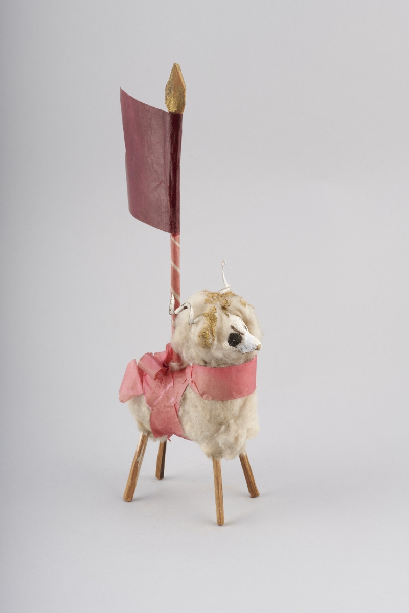 Agyagból kialakított törzs és fej fehérre festve, szemek, szemöldök grafitceruzával meghúzva. Piszkos fehér vattával beborítva. A vatta a homlokon aranyszínűre festett. A homlokon kétoldalt keskeny fémlemezből többször csavart, fehérre festett szarvak. Négy ferdeállású pálcikalába van. Háta közepébe beszúrt pálcikanyélen vörös papírzászló, a nyél piros és fehér papírral betekerve. A derék és nyak körül rózsaszín selyempapírszalag.