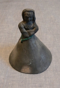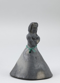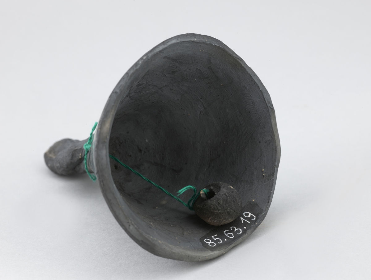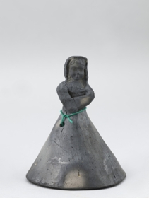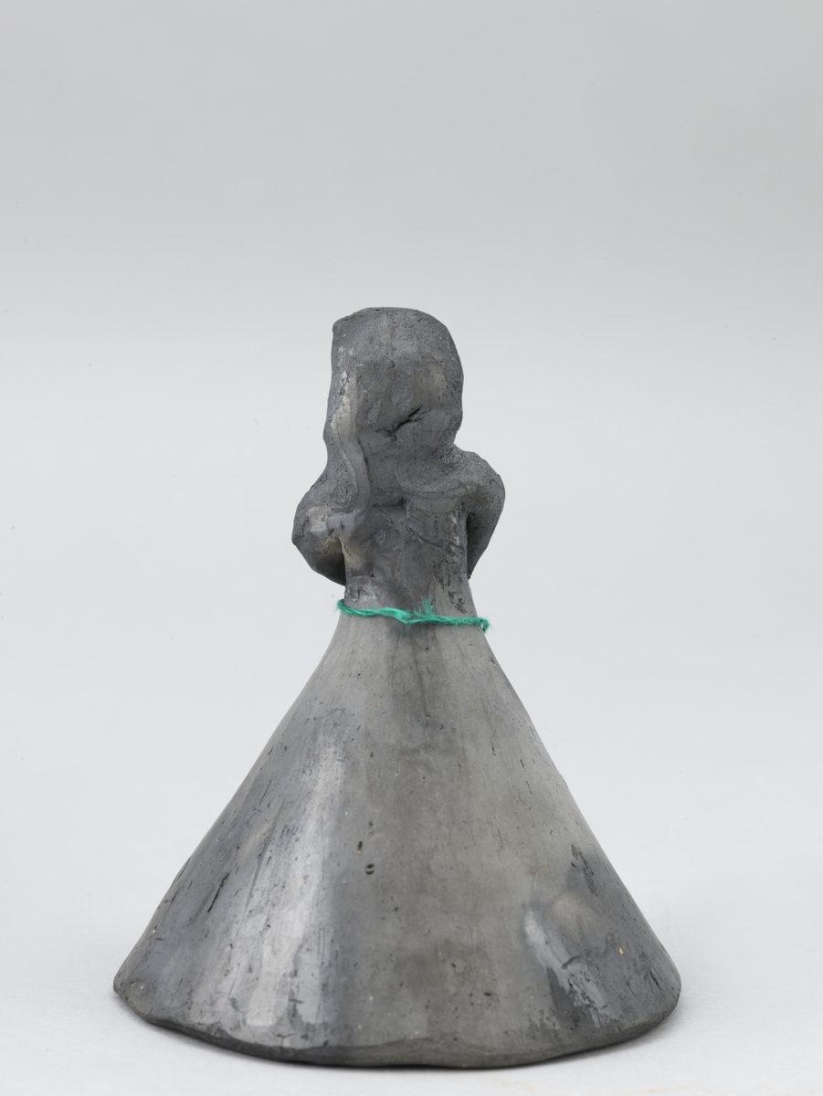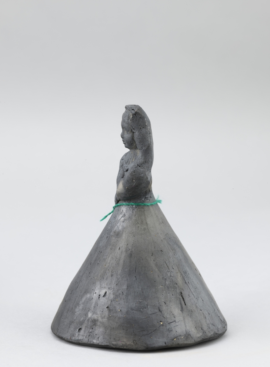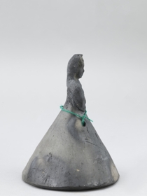 Agyagból kézzel formált, feketére égetett, lányka formájú harang, arca, mellkendője sablonban készült. A harang nyelve zöld fonalra kötött agyaggolyó.