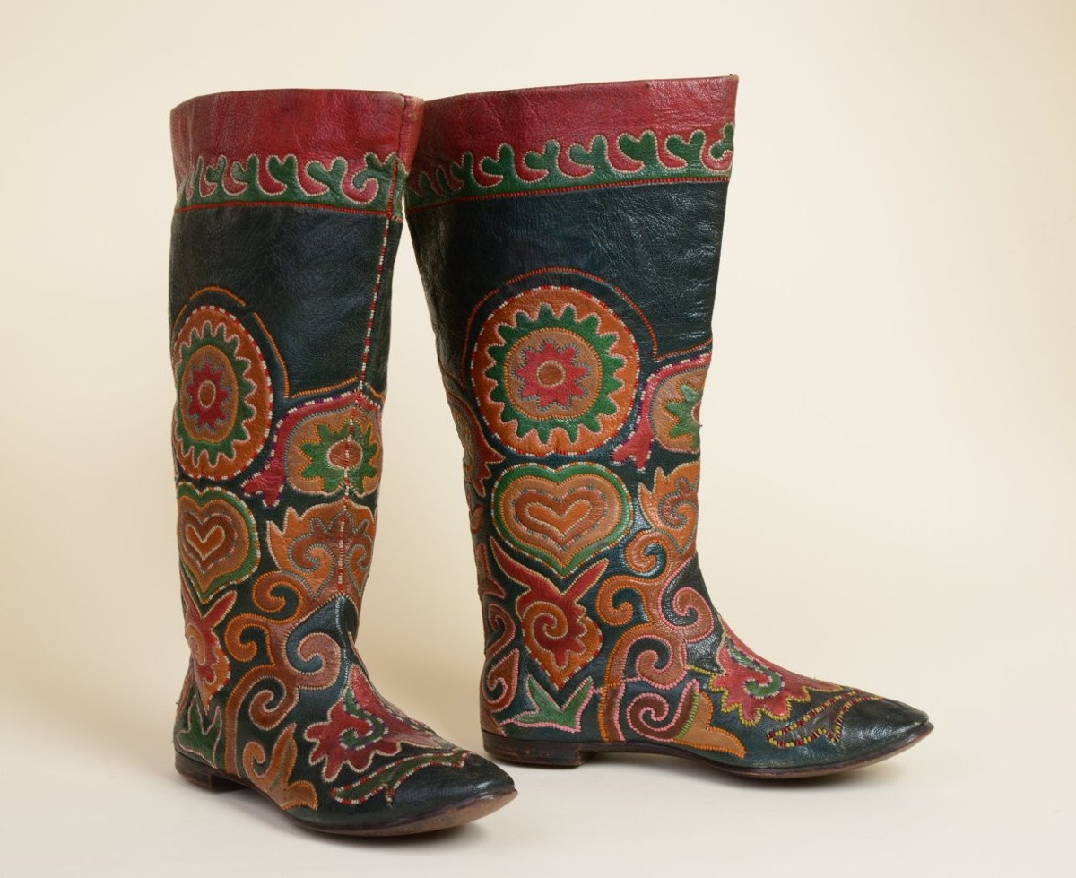 Zöld bőrből, intarziás, kerek tetejű, elöl varrott szárú, szögezett talpú egylábas. A szártető széle piros, illetve zöld bőrrel szegett. A két szín találkozásánál reciprok mintás. A szár igen gazdag intarziás díszítésű, szív, virág és kacskaringó mintákkal, ugyanígy a fej is. A bőr intarziák színes gyöngyvarrással varrottak. A szár és a fej nyers színű vászonnal bélelt. A talp szögezett és egylábas, a lágyék közepében négy köröcskéből álló poncolt jel. Az orr hegyesen, szögletesen kerek, a sarok igen lapos és vasszögekkel felerősített.