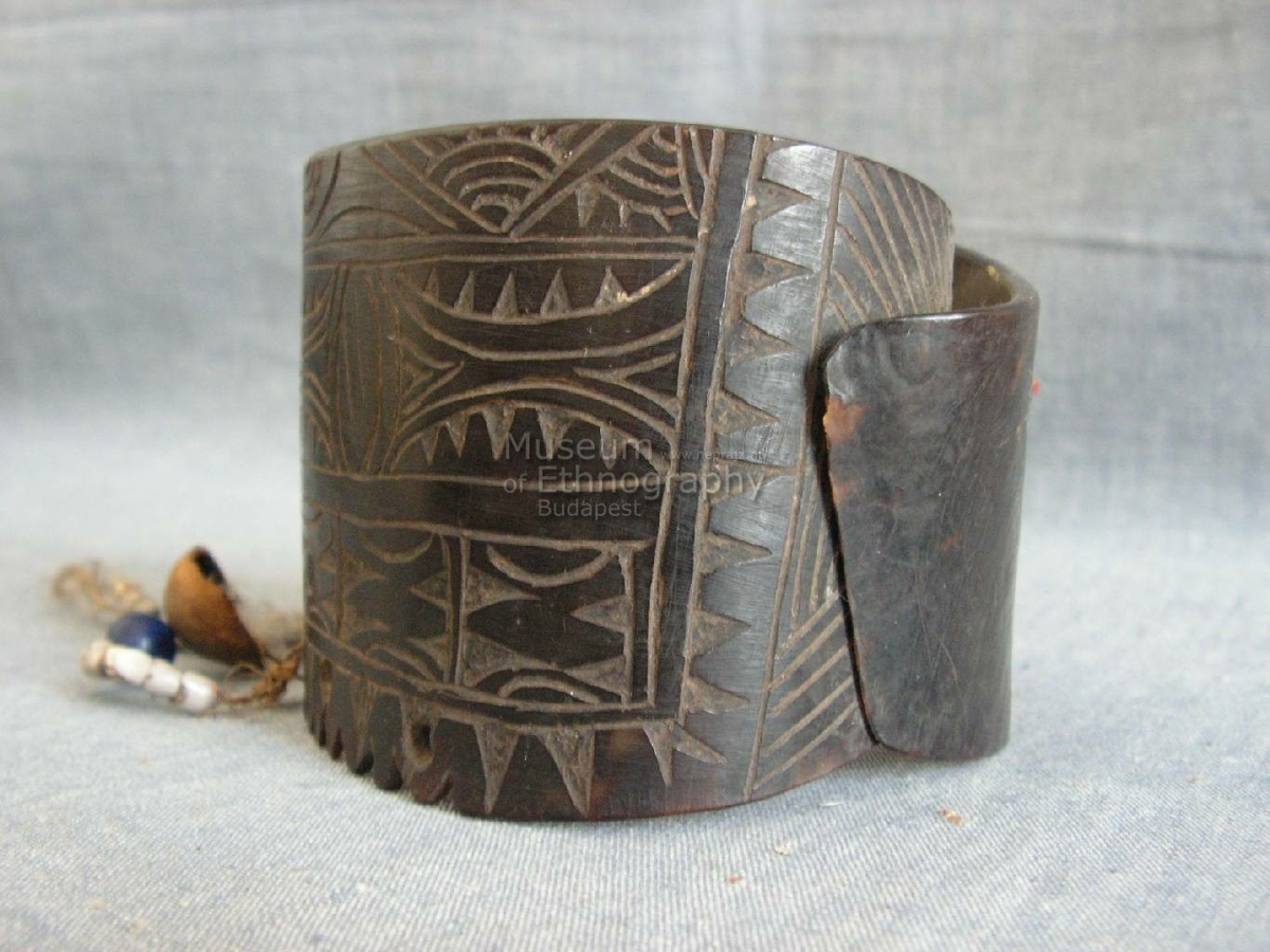 Hengeresre hajlított teknőshéj. Szine sötétbarna. Végei egymásra hajlanak, a belső elkeskenyedve háromszöget alkot, MAGOLATAL jellegű mintával. Külső felületén vésett geometrikus mintáza borítja. A függőleges oldalával párhuzamosan farkasfoggal kitöltött vonalak határolják. Függőleges oldalával párhuzamos vonalak osztják három szélesebb és egy keskenyebb sávra, amelyek díszítése fenntről lefelé: KANKANok és párhuzamos félkörök; helykitöltő FŰRÉSZFOG váltakozik oválisokat; fél KEMATENek egymásnak háttal köztük ovális. Alsó fele farkasfogas, 6 lyukkal, 3ban felfüzött magvakból álló sorok vannak, egyiken sötét kék üveggyöngy nagyobb maghéjjal.