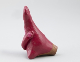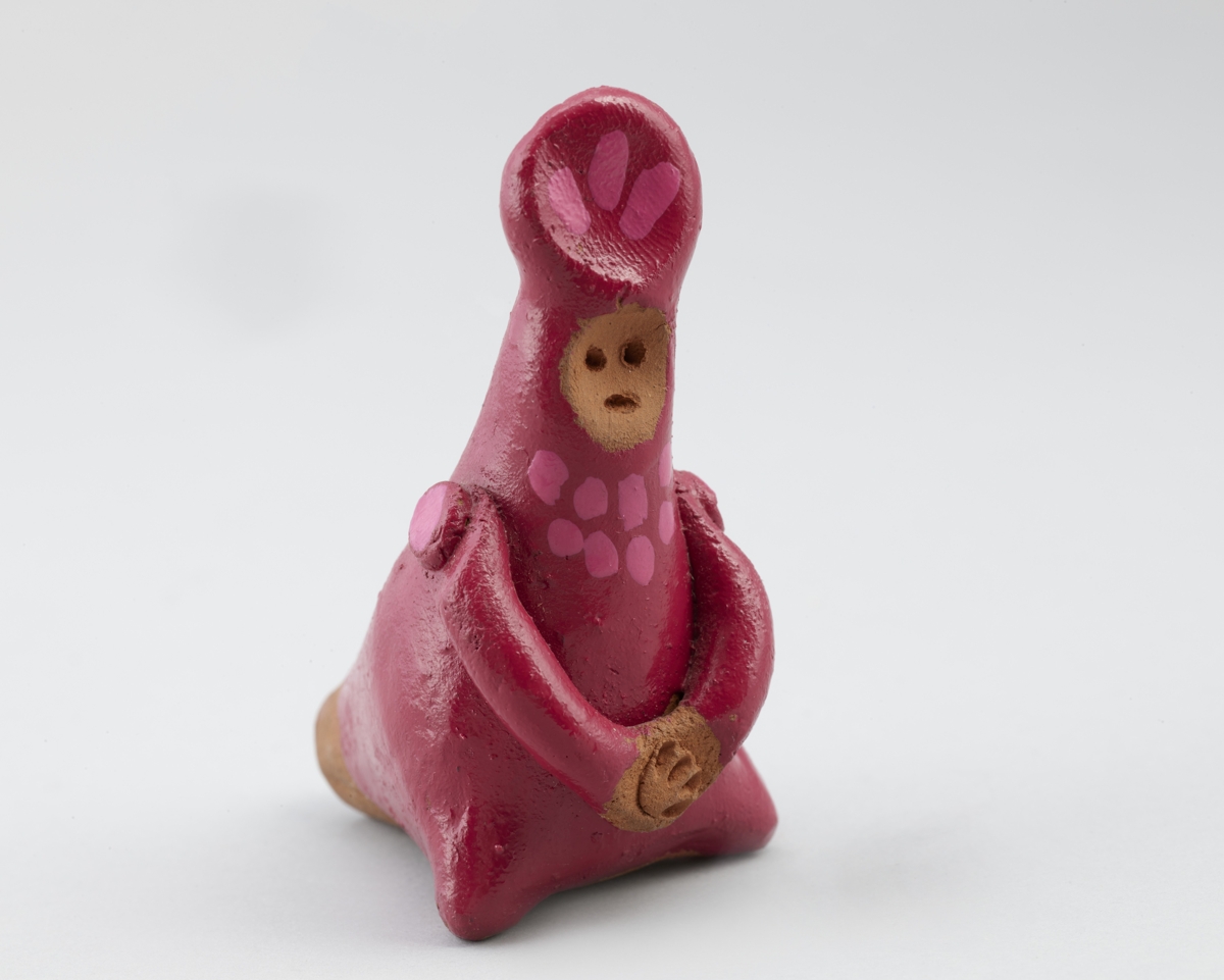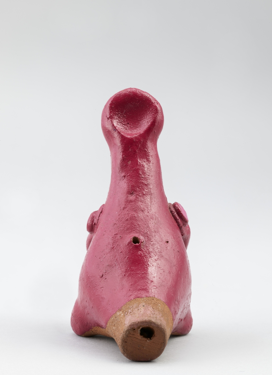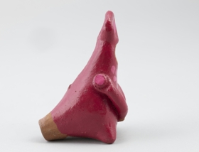 Égetett agyagból készült női alakot formáló síp. Stilizált ruhája bordó színű, magas fejviselete és a nyakrésze világosabb színnel pontozott. Kezeit elől összekulcsolja.