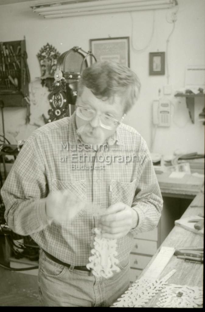 Vágott és vágott-fonott sallang szabásmintái (kartonpapír). Nepp Dénes saját tervezése, kézzel vágja ki a szabásmintákat és a sallangot is.